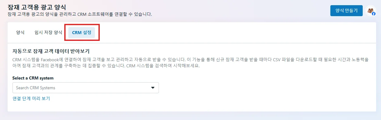 3. 양식 페이지에서 CRM 설정 메뉴를 클릭합니다.