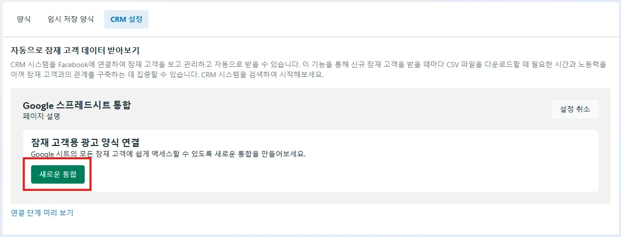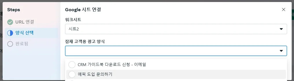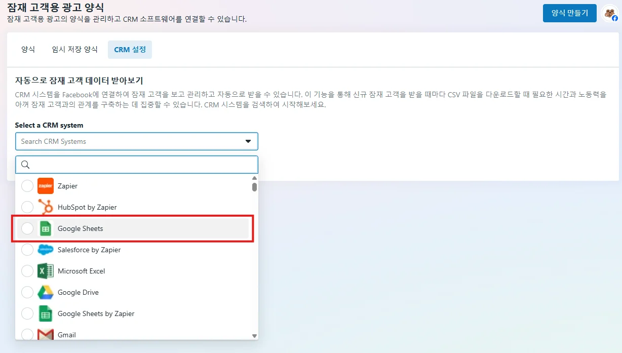 4. 연결되는 CRM 시스템으로 Google Sheets를 선택하고 구글 로그인을 진행합니다.