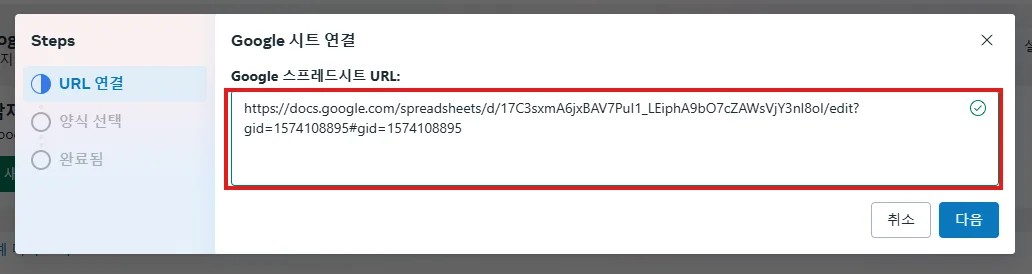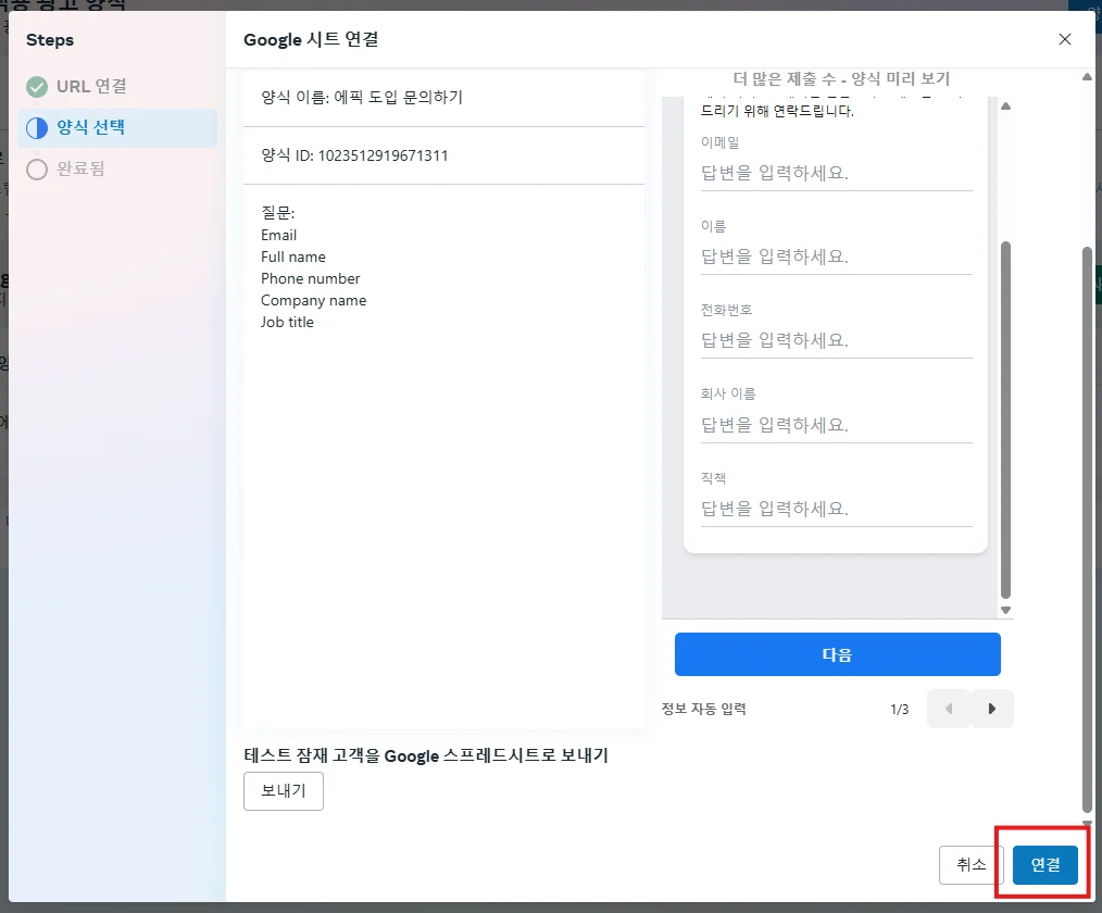 6. 원하는 워크시트(구글시트 탭 이름)와 양식을 선택하고 연결 버튼을 누르면 완료됩니다.